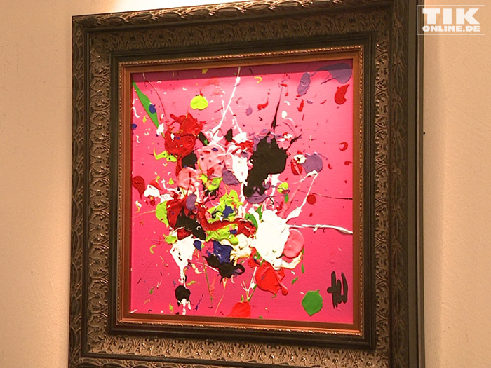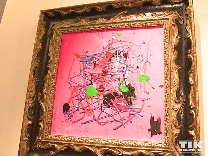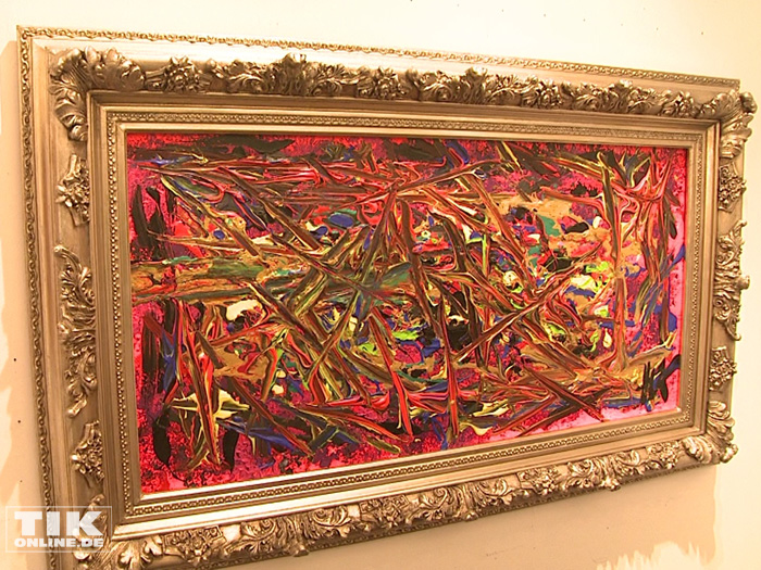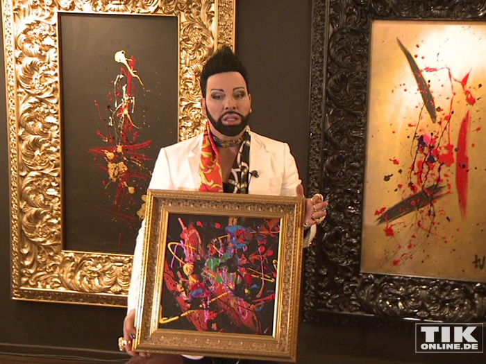 Stolz präsentiert Harald Glööckler eines seiner abstrakten Kunstwerke in der Mensing-Galerie.