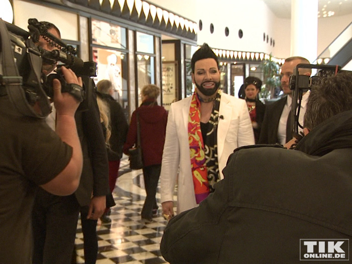 Wie immer durchaus auffällig geschminkt und angekleidet erschien Harald Glööckler zu seiner Vernissage-Eröffnung in den Berliner Friedrichstadt-Passagen.