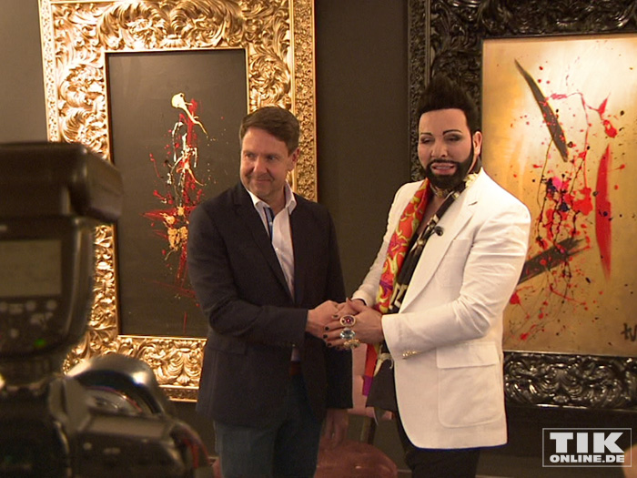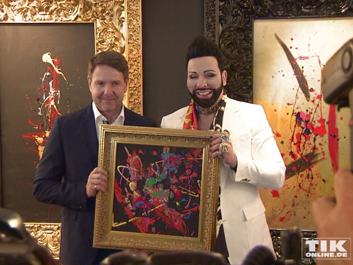 Der stolze Künstler Harald Glööckler und der ebenfalls stolze Galerist Harry Mensing halten eines von Glööcklers Kunstwerken in die Kameras.