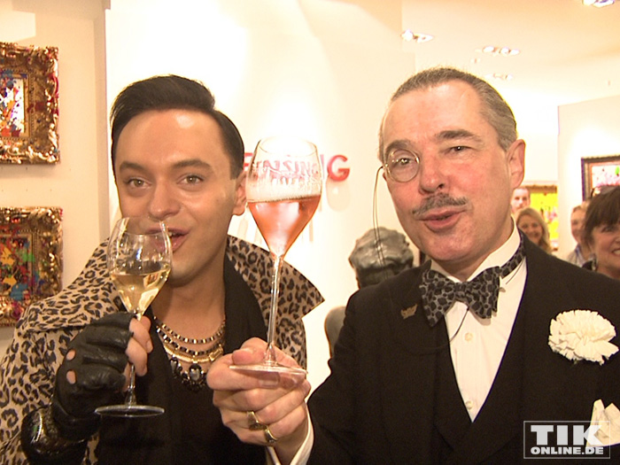 Harald Glööckler schüttelt nach einer erfolgreichen Vernissage-Erföffnung Hände mit dem zumständigen Galerist Harry Mensing.