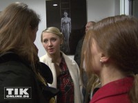 Die Fotografin hat für ihre Bilder zehn prominente Frauen wie Bettina Zimmermann, Magdalena Neuner, Nina Eichinger, Sarah Wagenknecht, Jeanette Hain und Katja Riemann ungewöhnlich in Szene gesetzt. Jeanette Hain posiert zum Beispiel nackt im Nebel oder Bettina Zimmermann leicht bekleidet beim Zwiebelnschneiden. Hingucker der Vernissage war aber ein Bild von Katja Riemann, das an den gekreuzigten Jesus erinnert.