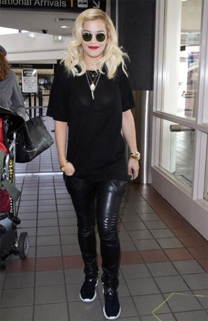 Rita Ora ist angesagter und erfolgreicher denn je. Hier beweist sie wieder Stilgefühl indem sie ein schwarzes T-Shirt mit einer schwarzen Lederhose und schwarzen Sneakern kombiniert. Mit Schmuck und einer Sonnenbrille baut sie Blickfänge in das lässige Outfit ein.