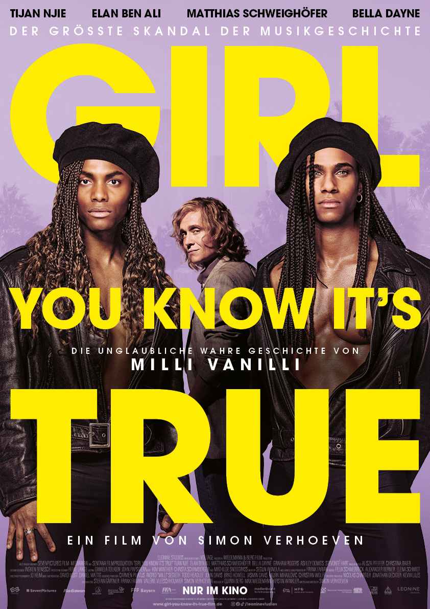 GIRL YOU KNOW IT’S TRUE von Erfolgsregisseur Simon Verhoeven beleuchtet die wahre Geschichte der beiden Tänzer Robert Pilatus und Fabrice Morvan alias Milli Vanilli und ihrem märchenhaften Aufstieg zum schillerndsten Pop-Duo der späten 80er Jahre. Sie werden über Nacht zu gefeierten Stars, ein Traum geht in Erfüllung. Doch sie ahnen noch nicht, welchen Preis sie dafür zahlen werden. Der internationale Kinofilm besticht mit großen Bildern, einem fantastischen Cast und einer unglaublichen, aber wahren Geschichte. GIRL YOU KNOW IT’S TRUE startet am 21. Dezember 2023 bundesweit in den Kinos.