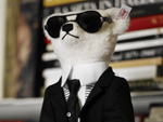 Schwarze „Lagerfeld Eyewear“-Sonnenbrille, weißes Popeline-Hemd mit Stehkragen, schwarze Jeans und eine Jacke aus schwarzem Wollstoff machen den Bären zum perfekten Lagerfeld-Doppelgänger.