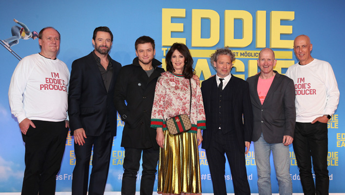 Im Schlepptau hatte Jackman seine Co-Stars Taron Egerton und Iris Berben, Regisseur Dexter Fletcher und natürlich den echten Michael „Eddie The Eagle“ Edwards. Edwards war in den 80er Jahren zu einer Kultfigur geworden, als er als erster Brite für sein Land als Ski-Springer bei Olympischen Spielen teilnahm.