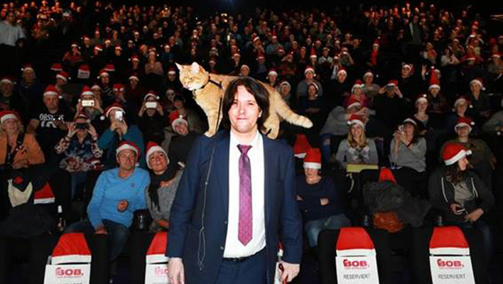 Der Roman wurde nun verfilmt und feierte am Nikolaus-Tag im Kino in der Berliner Kulturbrauerei seine große Deutschland-Premiere. Natürlich waren auch Bob und sein Herrchen James Bowen gekommen. Als kleine Überraschung erwartete das Duo ein Kinosaal voll mit Nikoläusen, die die beiden begeistert empfingen. Sowohl James Bowen als auch Kater Bob genossen die Aufmerksamkeit in vollen Zügen.