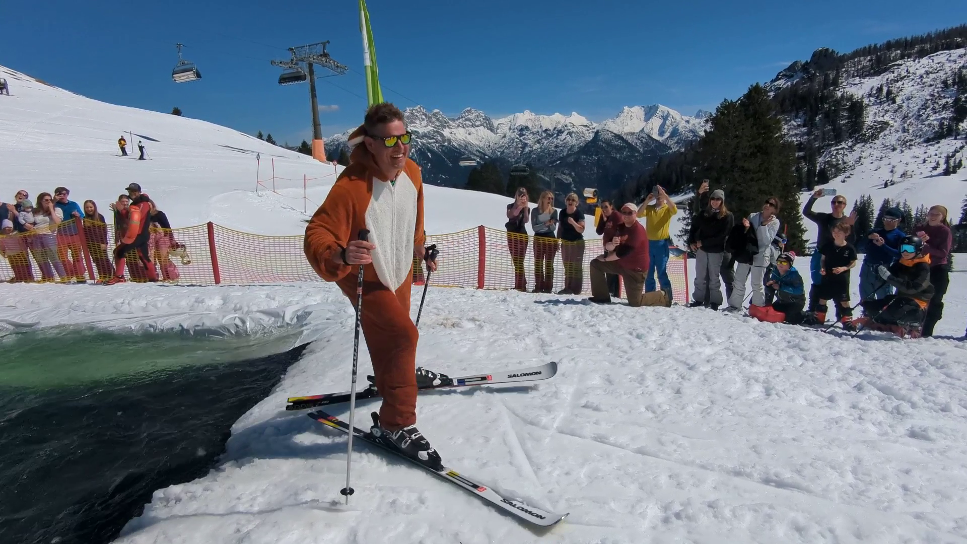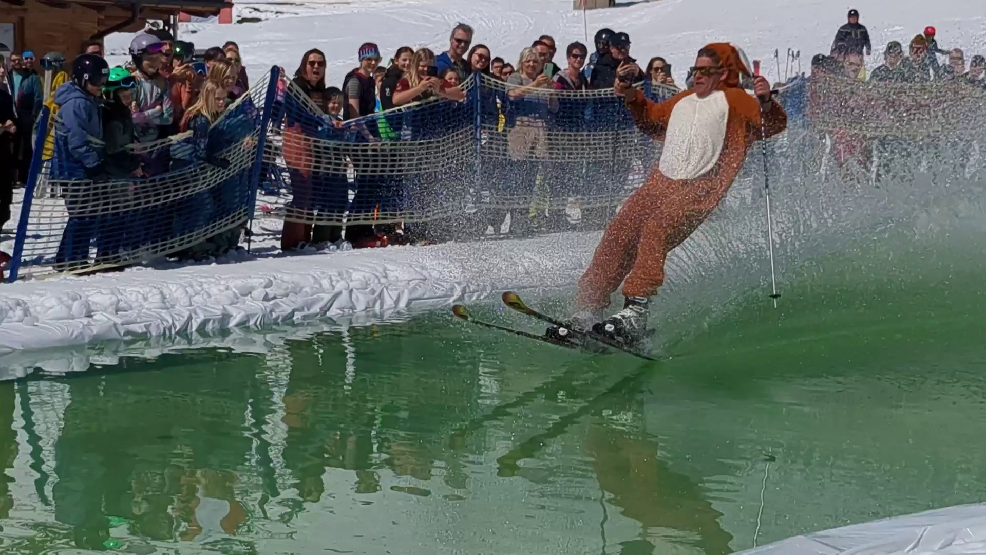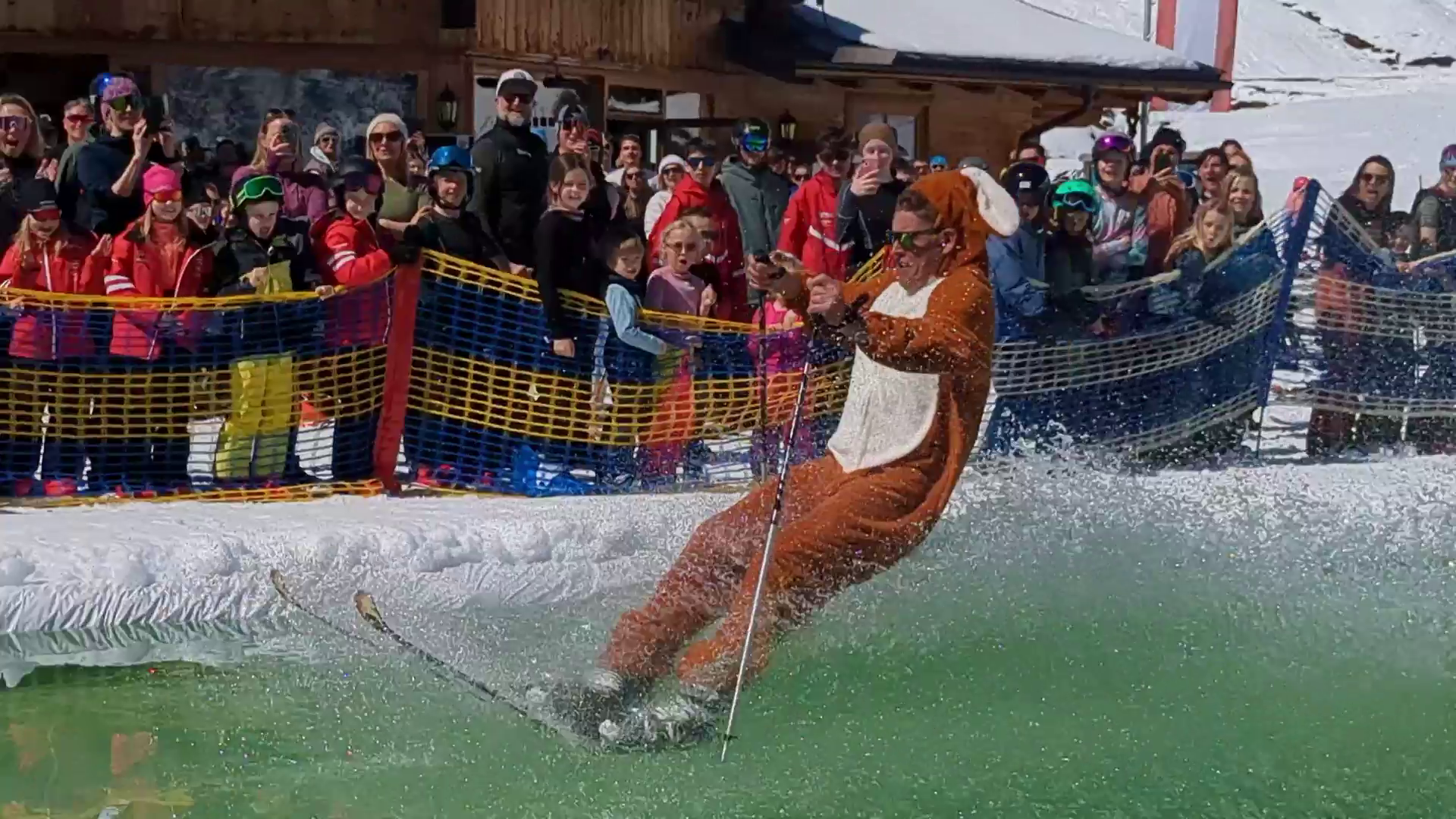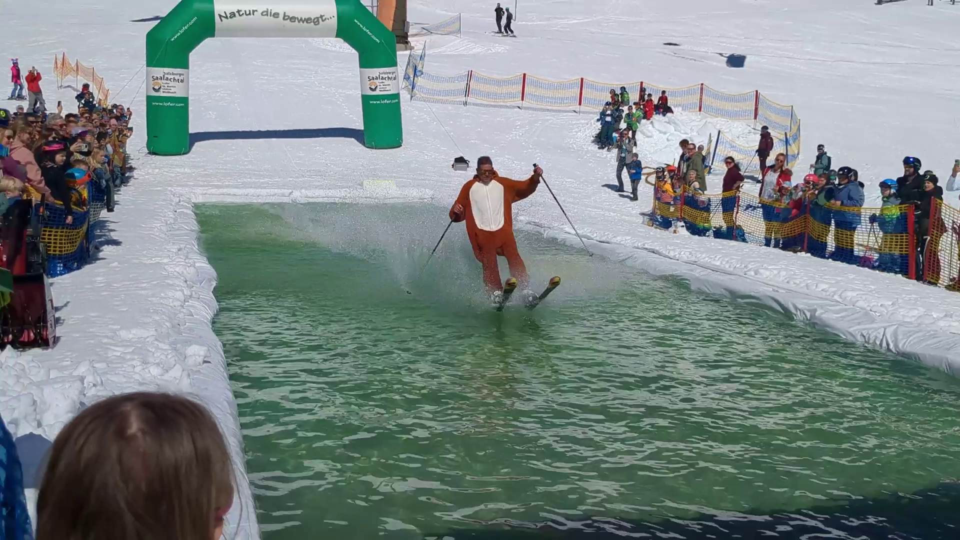 Der Osterhase höchstpersönlich machte auf Skiern den Anfang, sauste die Piste hinunter und landete samt seinem schönen Hasenkostüm klitschnass im Wasser. Sogleich warf man den Rettungsring. Der Hase ließ sich nicht entmutigen und schaffte es beim zweiten Mal die Wasserfläche zu übergleiten. Das Publikum jubelte. Viele waghalsige Gäste machten es dem Hasen nach und schafften es – mal trocken, mal pitschnass – den Eis-Pool mitten im Schnee zu passieren. Für die Gäste war es jedenfalls eine große Gaudi, den Sportlern bei ihrem Saisonabschied der besonderen Art zuzuschauen.