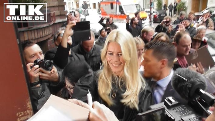 Mit über einer halben Stunde Verspätung traf Claudia Schiffer in der CWC Gallery in Berlin ein. Bereits ihre Ankunft war spektakulär! Beim Aussteigen aus der Limousine wurde sie bereits von Menschen umringt. Strahlend schrieb das Supermodel Autogramme und ließ sich von der Menge im Gedränge in die Galerie schaukeln.