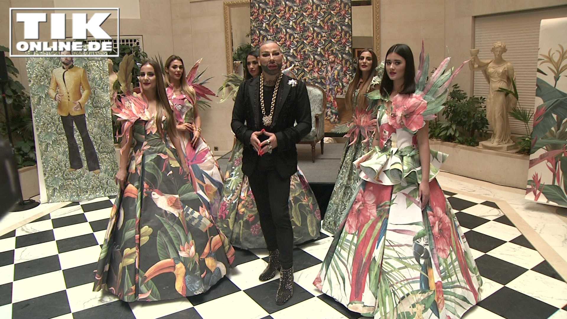 Blitzlichtgewitter für Harald Glööckler im Berliner Hotel Adlon! Der Modezar erschien in einem völlig neuen Look: Das Haarteil hat er abgelegt, den Kopf zeigt er frisch rasiert mit schwarzen Stoppeln. Die Lippen sind prall, das Kinn schmal, die Wimpern lang. Um ihn herum stolzieren Models – in Tapeten gehüllt! Denn der Modezar hat eine neue Tapetenkollektion entworfen. Palmen, Urwald und wilde Tiere sollen in Zukunft die Wände zieren. Das passt auch ganz gut. Denn demnächst nimmt der „Pompöös“-Macher an der RTL-Show „Ich bin ein Star – Holt mich hier raus“ teil.