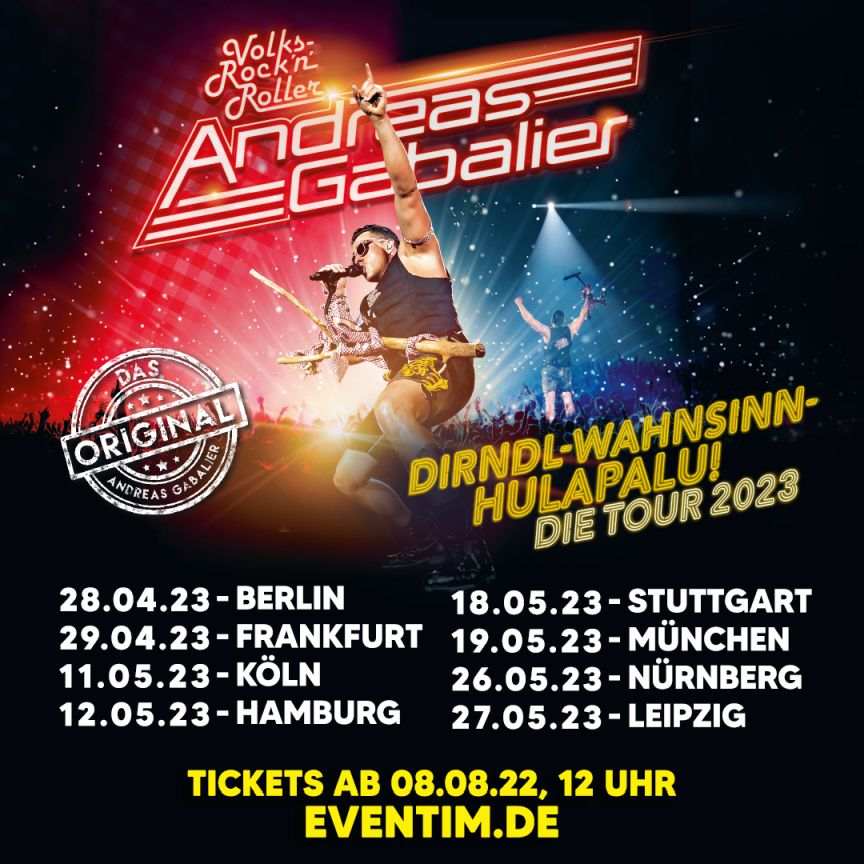 Mit Lederhose und rot-weiß-karierter Sonnenbrille und dem einmaligen Mix aus Volksmusik und Rock bringt er seine Fans auf Touren. Es war mit über 90.000 Besuchern das bisher größte Konzert von Andreas Gabalier – das Volks-Rock´n´Roller Fan-Festival am vergangenen Sonntag auf der Messe München. Nach seinem bombastischen Open-Air-Sommer 2022 nun eine tolle Ankündigung für alle Fans: Im Frühjahr 2023 geht es mit seiner Tournee „Dirndl – Wahnsinn – Hulapalu“ weiter.
