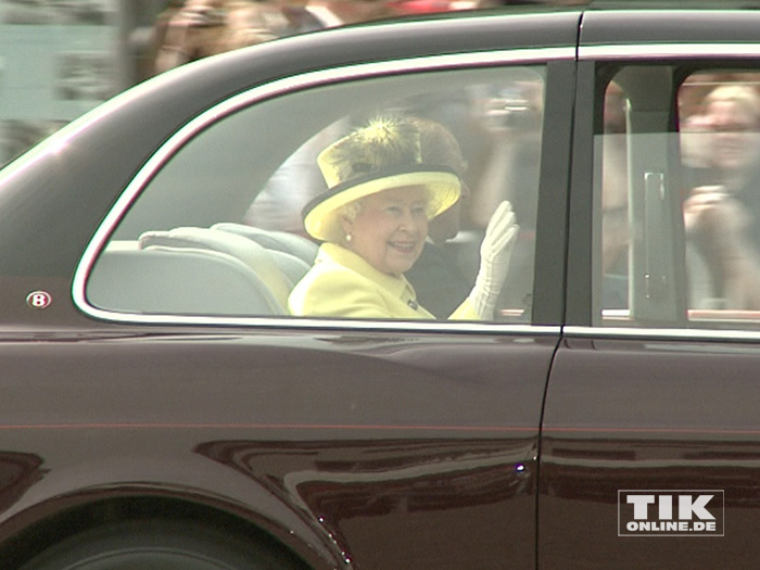 Queen Elizabeth II. winkte den Schaulustigen auf dem Pariser Platz in Berln aus ihrem Bentley heraus zu