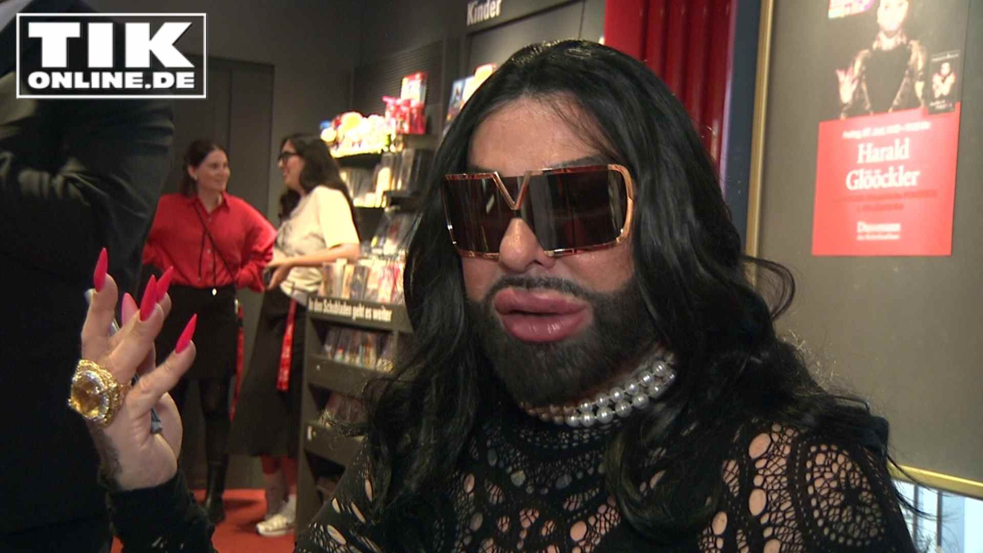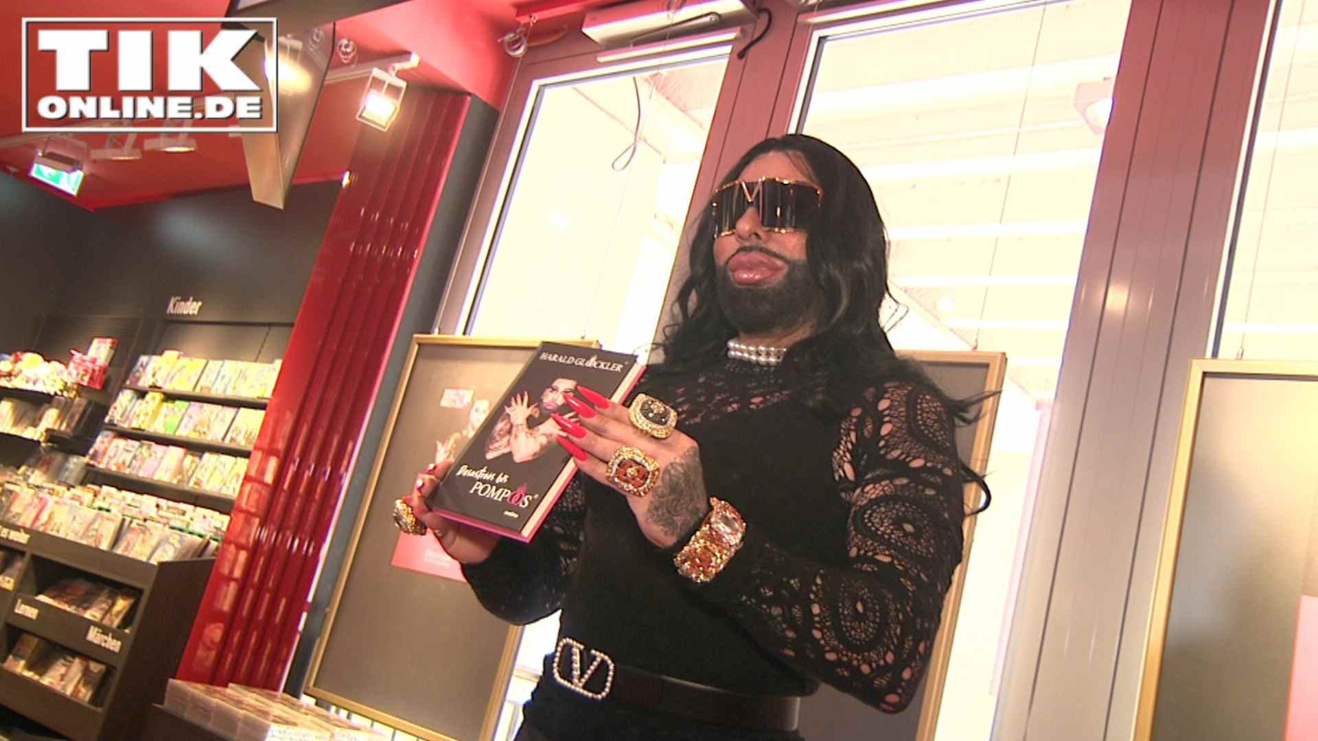 Mit wallendem langen Haar, Sonnenbrille und einem Oberteil in schwarzer Spitze schwebt uns Harald Glööckler entgegen. Fast sieht er aus wie die ältere Schwester von Conchita Wurst. Der Modezar hält Einzug im Berliner Kulturkaufhaus wo er seine neue Biografie „Desaströös bis POMPÖÖS“ vorstellt. Lange Schlagen von Fans sind zu sehen. Der Meister zeigt stolz sein neues Werk in die Kameras.