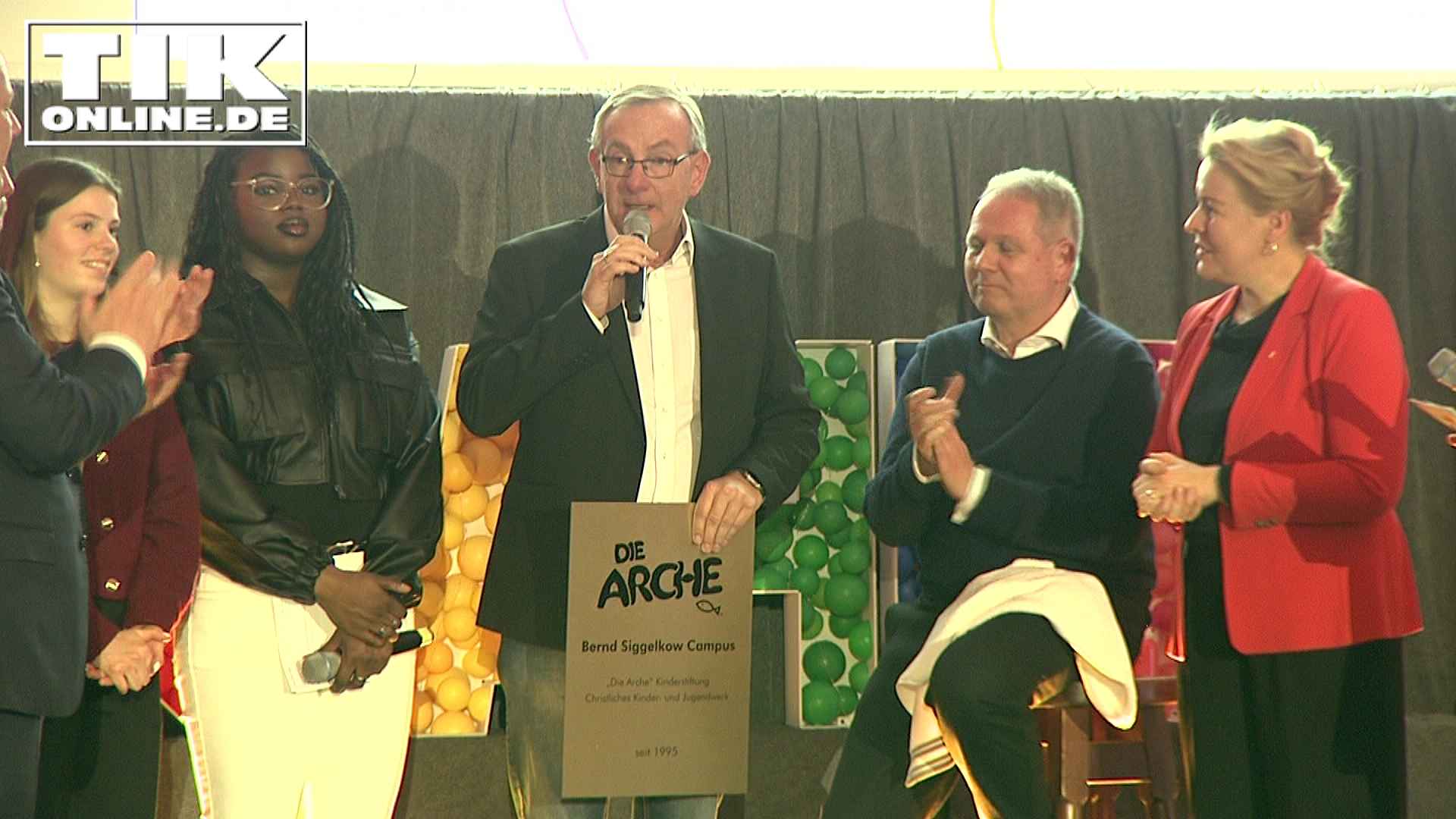 Auf der Bühne zeigten Arche-Kinder bei der Feier Kreativität und Herzlichkeit. Eine Gruppe singt „Kinder an die Macht“, andere Kinder zeigen einen Tanz in Tierkostümen, Rapperin Beathany aka Filou begeistert mit eigenen coolen Songs. Besonders rührende Momente und Freudentränen gibt es als Arche-Gründer Bernd Siggelkow auf der Bühne von einer Gruppe ehemaliger Arche-Kinder überrascht wird. Standing Ovations für Pastor Siggelkow. In einem sehr persönlichen Interview erzählt er uns über die Geschichte der Arche: „Ich glaube die Arche hat nicht nur die Kinderarmut aufgedeckt, sondern sie ist ein zweites zu Hause für die Kinder geworden. Wir haben mittlerweile 100.000 Kinder durch die Arche geschleust. Davon haben wir viele Biografien verändert. Wir haben alleine hier in der Arche Hellersdorf das neunte ehemalige Arche-Kind als Erzieherin eingestellt. Das ist großartig.“