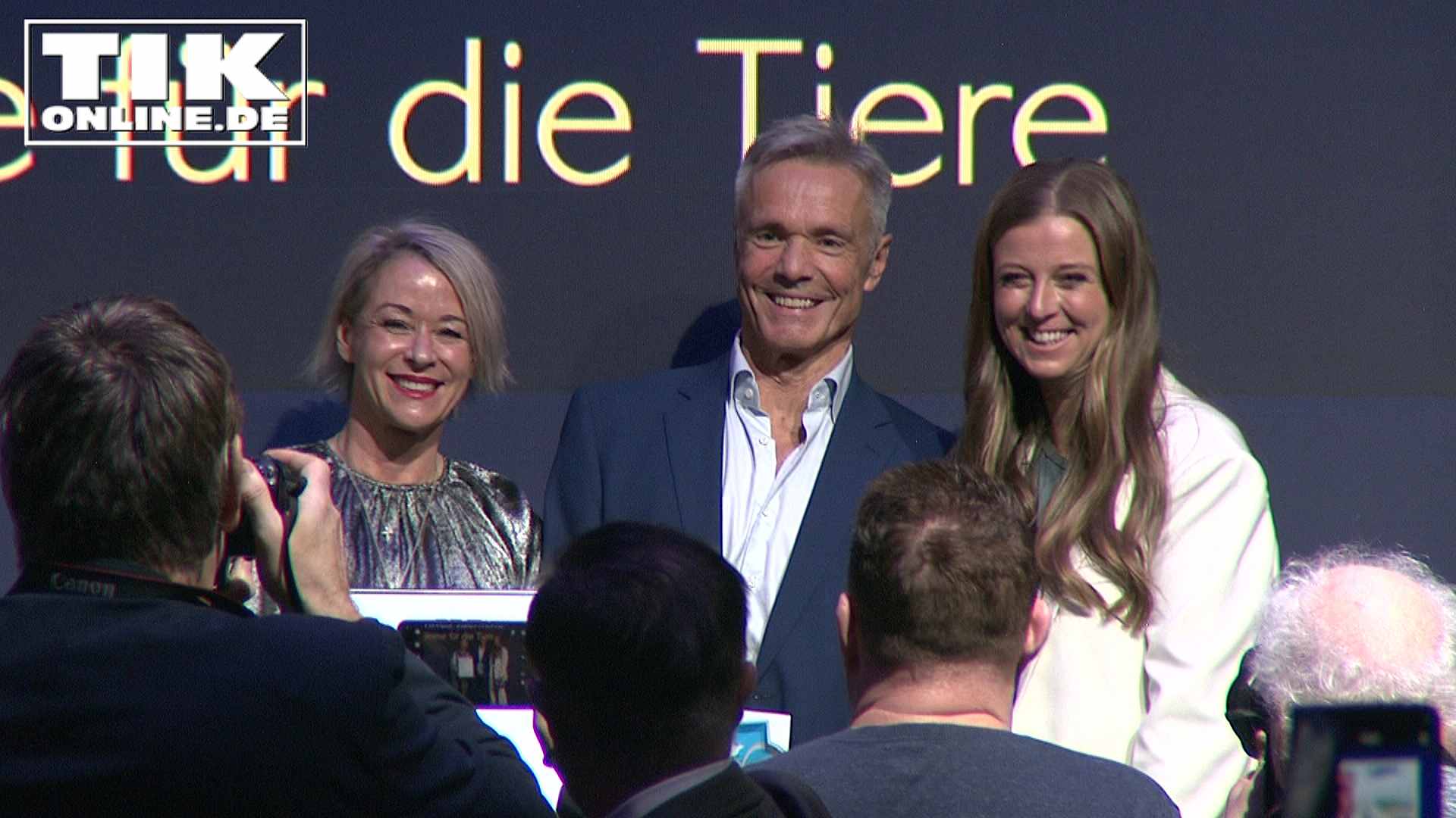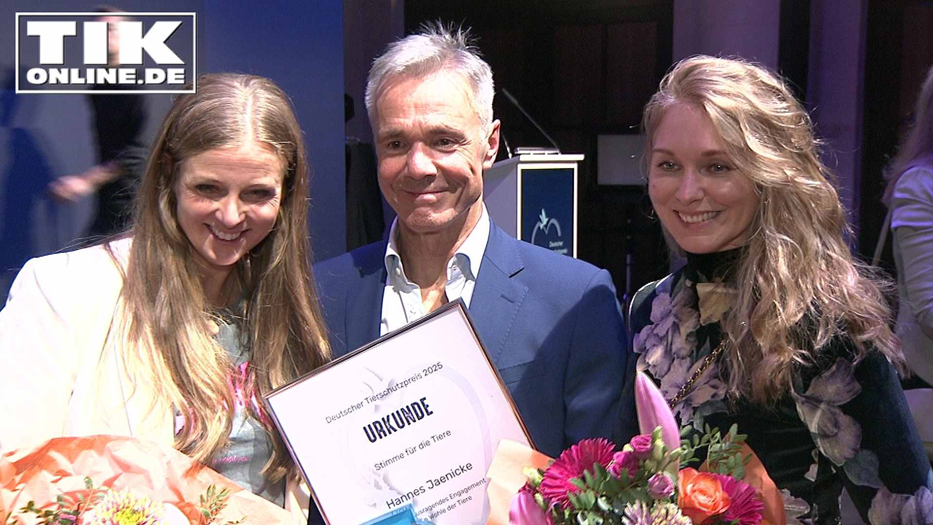 Moderatorin Nina Eichinger und Stephanie Krogmann neben Preisträger Hannes Jaenicke