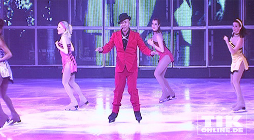 Zwar heizte der Chartstürmer („Mambo No. 5“) mit seinen Hits die Tropicana-Show auf, doch war 35-Jährige war etwas zitterig auf den Kufen. Ehe Lou Bega seinen Eis-Mambo performte, wurde er von hübschen Damen auf die Eisfläche geleitet. Auch den Abgang schaffte er irgendwie nicht allein.