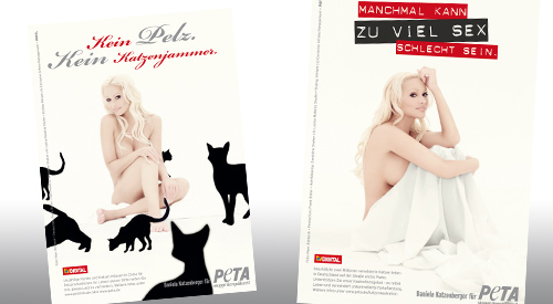 Das zweite Motiv zeigt die nackte Daniela umringt von stilisierten Katzen. Darüber prangt der Satz „Kein Pelz, kein Katzenjammer“, mit dem die TV-Blondine gegen die Nutzung von Katzenfell protestiert.