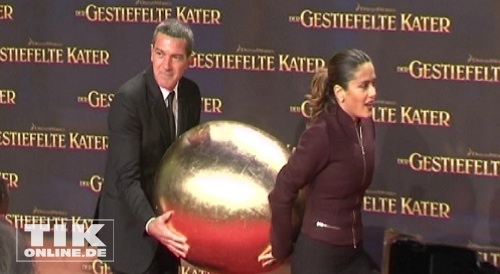 Reichlich Spaß hatten Salma Hayek und Antonio Banderas bei der Premiere des 3D-Kinostreifens „Der gestiefelte Kater“ in Berlin. Erst tummelten sich die Hollywoodstars bei ihren Fans und schrieben jede Menge Autogramme, dann posierten sie strahlend mit ihren deutschen Synchronkollegen Andrea Sawatzki und Christian Berkel.