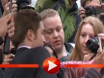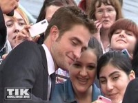 Er blieb auch trocken, während seine Fans auch mal pitschnass aus der Wäsche schauten. Zwei Regenschirme schützen ihn vor der Witterung. Eine junge Frau ließ es sich nicht nehmen und umarmte Pattinson energisch. Der ließ es geschehen, lief dann aber gleich weiter.