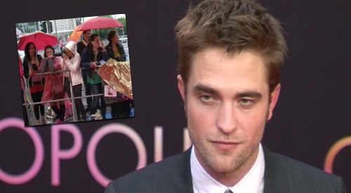 Die Fans warten im Regen auf Robert Pattinson.