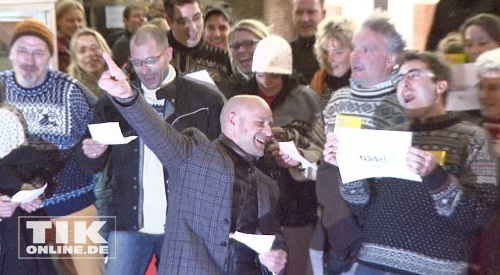 Am Ende kamen gerade mal 15 Pulli-Träger, die sich aber nicht minder ins Zeug legten. Jürgen Vogel stimmte tapfer „Take On Me“ an und die singenden Pullover-Fans durften gratis ins Kino.