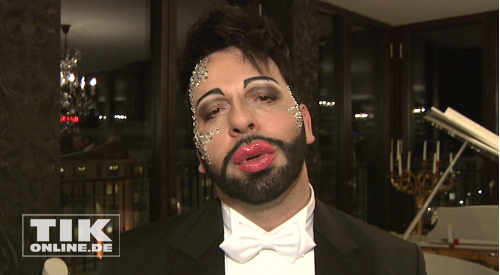 Dann endlich kam der Meister selbst. In einem langen, schwarzen Kunstpelzmantel begleitet von der schrillen amerikanischen Modeikone Amanda Lepore, schritt Harald ins Blitzlichtgewitter. Dann ging’s in sein Penthouse. Dort empfingen viele goldige Oben-Ohne-Jünglinge die Gäste mit Pralinen, es wurde Champagner gereicht. Harald posierte mit seinen Gästen für die Kameras und sein Gesicht funkelte besonders glitzernd mit einem ganz besonderen Schmuck. Harald Glööckler erklärte im Interview: „Das sind Swarovski Elements Kristalle und ich dachte, dann lassen wir es im Gesicht mal richtig funkeln zu 25 Jahre, ein Feuerwerk im Gesicht.“