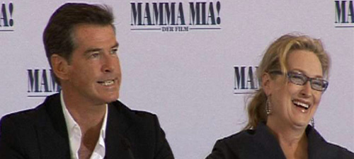 Schon seit einigen Tagen sind die Hollywood-Stars Meryl Streep und Pierce Brosnan in der deutschen Hauptstadt. Nach einigen Tagen Müßiggang verrichteten die beiden Stars heute nun wieder gewohnt professionell ihren Job und rührten kräftig die Werbetrommel für ihren neuen Film „Mamma Mia“.