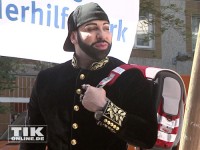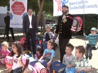 Harald Glööckler erschien bei strahlendem Sonnenschein im dunklen Anzug auf dem Spielplatz vor dem Deutschen Kinderhilfswerk in Berlin. Um ihn herum eine ganze Kinderschar!