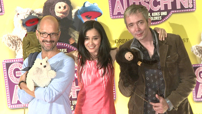 Mit den Handpuppen hatten Puppenspieler-Legende René Marik und die Schauspieler viel Spaß auf dem roten Teppich. In der skurrilen Krimi-Kömödie mimt „Stromberg“-Star Christoph Maria Herbst als menschlicher Darsteller einen zwielichtigen Typen.