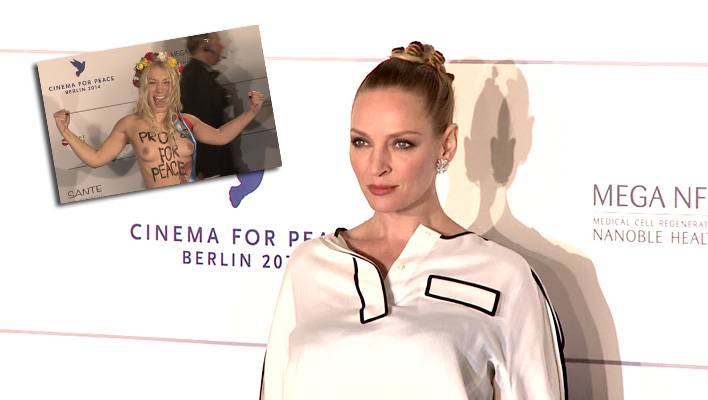 Dann wurde blank gezogen. Eine Femen-Aktivistin posierte halb nackt für die Fotografen und warb mit ihren Brüsten für Frieden.