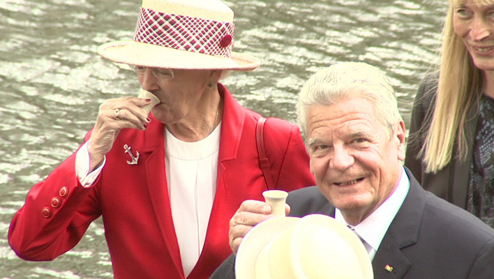 Dort wurde die Königin von Bundespräsident Gauck begrüßt. Gemeinsam bestieg man ein Wikingerschiff. Und wie bei solchen Anlässen üblich, trank man zuerst einen guten Schluck Met. Der Präsident, seine Lebensgefährtin und die dänische Königin hatten sichtlich Spaß. Man plauschte, von anderen Schiffen winkten Touristen und zum Abschied gab es natürlich für alle eine Flasche Hochprozentigen.