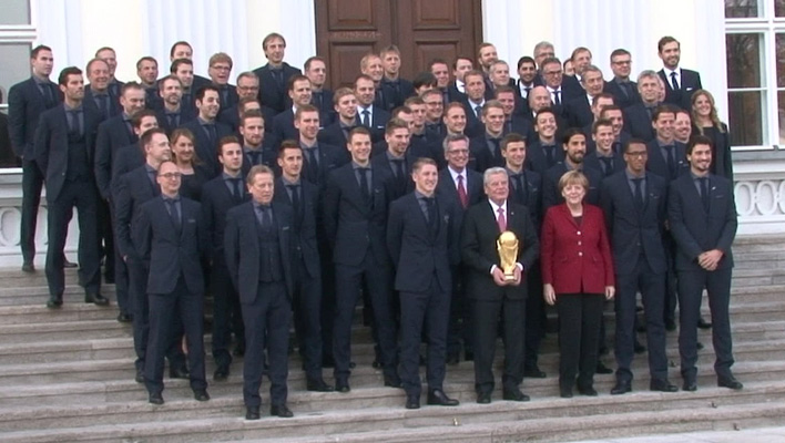 Für Joachim Gauck gab es eine ganz besondere Überraschung: Er durfte den WM Pokal nehmen und konnte es kaum glauben. Natürlich musste er ihn zurückgeben. Am Abend feiert noch der Kinostreifen „Die Mannschaft“ am Potsdamer Platz seine Weltpremiere. Der Streifen ist eine offizielle Dokumentation der FIFA-Fußball-Weltmeisterschaft in Brasilien 2014 und soll den Fans neue Bilder zeigen, die der Zuschauer weder im Stadion noch im Fernsehen sehen konnte. Vom Trainingslager in Südtirol über das Campo Bahia in Brasilien bis zur Siegesfeier in der Kabine.