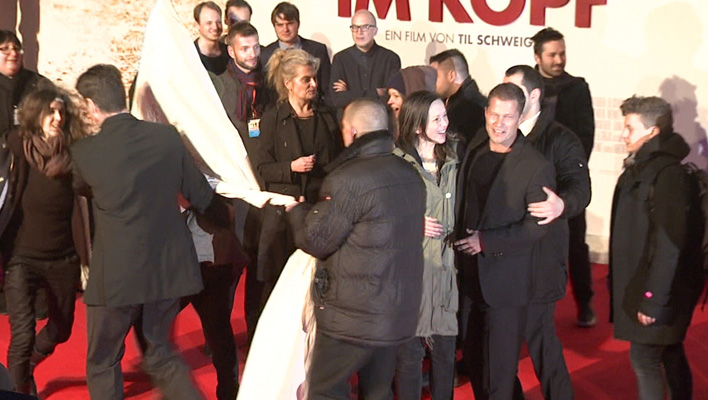 Erst recht spät konnten Security-Männer die Demonstranten stoppen. Da hatten sie schon den etwas verdutzten Schauspieler quasi umzingelt. Später sahen man sogar die Polizei am Rande der Premiere eingreifen. Til blieb eher gelassen, nahm eine Demonstrantin sogar schützend in den Arm.