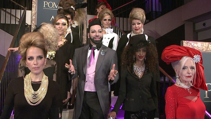 Pompööser Auftritt im Berliner Felix Club! Mit Ballet und Akrobatik beginnt die Fashion-Show, dann folgen Damen mit wild toupierten Haaren, aufwendigen Frisuren, Hüten oder Gold im Gesicht. Aber im Mittelpunkt steht natürlich die Mode, die sie tragen.