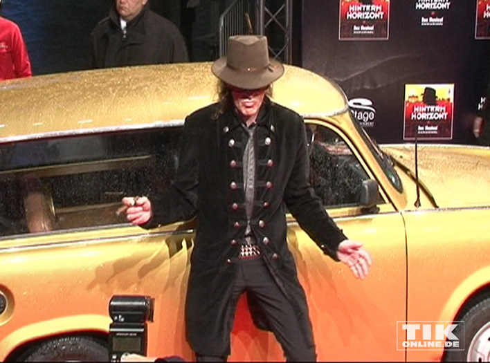 Udo Lindenberg posiert vor einem goldenen Trabi