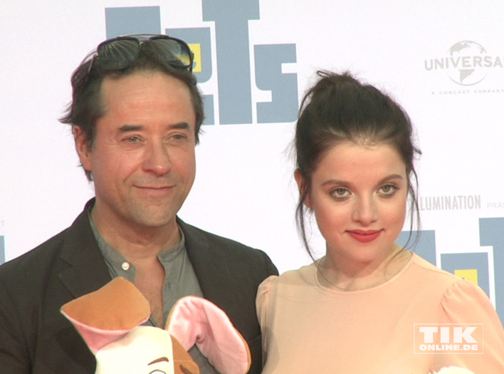 Jan Josef Liefers posiert mit Jella Haase bei der Premiere von „Pets (3D)“ in Berlin