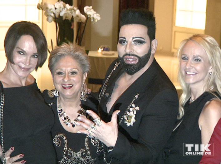Harald Glööckler posiert mit Anouschka Renzi, Dagmar Frederic und Kristine Bach