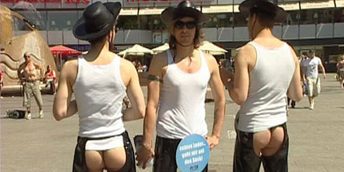 Am Berliner Kurfürstendamm präsentierten sich drei knackige Aktivisten der Tierrechtsorganisation PETA Deutschland mit Cowboy-Hüten, Lack-Chaps und vor allem mit nacktem Hinterteil. Mit dem Motto „Echte Kerle tragen kein Leder!“ wollen die drei sexy Cowboys darauf aufmerksam machen, wie Tiere unter der Verarbeitung von Leder leiden müssen.