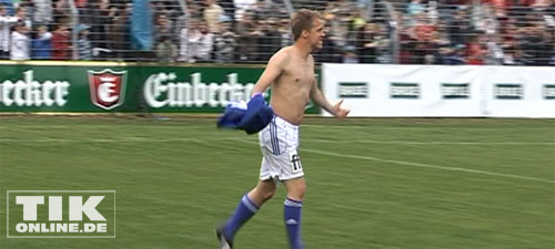 Nachdem Oliver einen Elfmeter verwandelte und sich vor Freude das Trikot vom Leibe riss, sah der Moderator gelb-rot und „durfte“ vom Platz gehen. Nicht ohne noch halb nackt seine Runden über den Rasen zu flitzen. Stolz präsentierte Pocher ein kleines Bäuchlein und schrieb Autogramme für seine Fans: „Wenn man so hart trainiert wie ich, dann kann man auch mal seinen Körper zeigen!“
