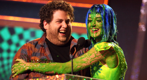 Und natürlich gab es auch wieder Schleimopfer. Besonders hart getroffen hat es dabei Katy Perry. Die Sängerin hielt mit „Superbad“-Star Jonah Hill die Laudatio in der Kategorie „Beste Schauspielerin“. In der Kiste, in der Katy den Namen der Gewinnerin vermutete, lauerte aber eine Ladung grüner Pampe, die ihr wunderschön ins Gesicht geschleudert wurde.