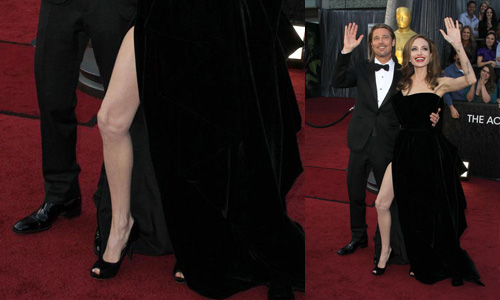 Das Glamour-Paar erschien nicht nur in Begleitung von Brads Eltern, auch Angelinas Kleid war ein echter Hingucker – besser gesagt der unglaubliche Schlitz, der den Blick auf ihr rechtes Bein freigab.