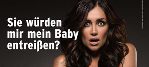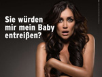 Mit schockiertem Blick hält sich die Brasilianerin ihren nackten Babybauch. Daneben prangt in großen Lettern die Frage: „Würden Sie mir mein Baby entreißen?“
