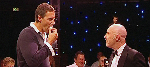 Für Michael Davis ist diese Übung ein Kinderspiel, für Ralf Moeller hingegen eine Herausforderung. Lässig und cool befolgte Moeller die Anweisungen seines Meisters und spuckte den Ball auch ziemlich gut durch die Luft. Allerdings landete der Tischtennisball direkt im Publikum!