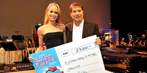 Zu Gunsten der Udo Jürgens-Stiftung überreichte Carien Keizer, Mitglied im Ensemble des Musical „Ich war noch niemals in New York“, dem Sänger vor seinem Auftritt in der Hamburger Color Line Arena einen Scheck in Höhe von 23.000 Euro. Die Darsteller des Hamburger Operettenhaus-Ensembles sammelten seit Beginn des Musicals am 2. Dezember 2008 kräftig für die Stiftung.