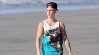 Ohne Shirt und nass vom Regen steht Justin Bieber in London und zeigt seine Bauchmuskeln …